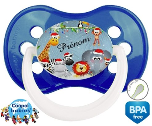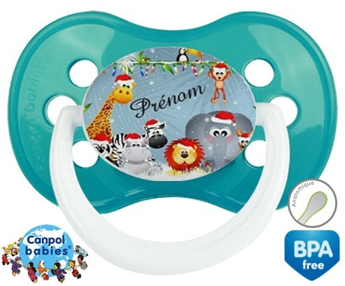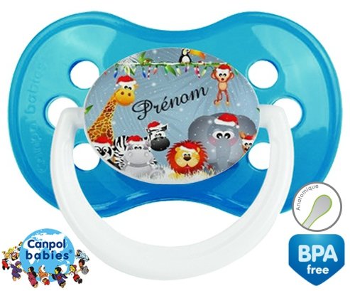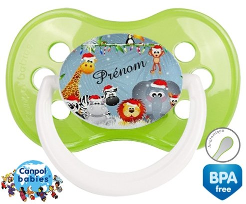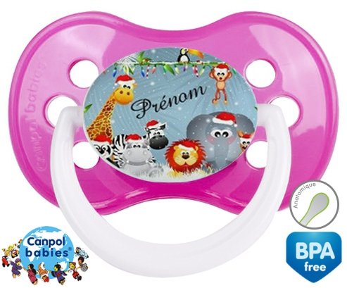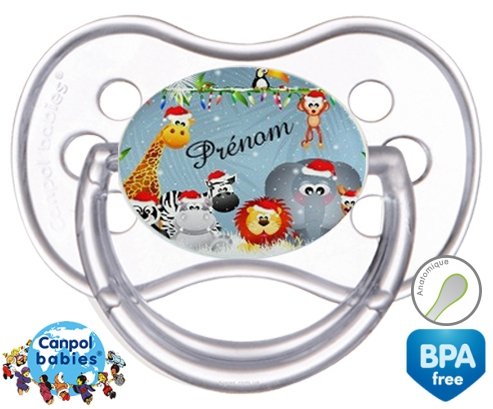 Sucette personnalisée pour bébé Animaux de noël + prénom à embout Anatomique en silicone de la marque Canpol Babies avec impression en en Couleurs de la collection Prénom personnalisé.La silicone se reconnaît par sa couleur transparente. C'est une matière souple, douce, sans goût ni odeur et offre à bébé une succion plus facile grâce à sa souplesse.