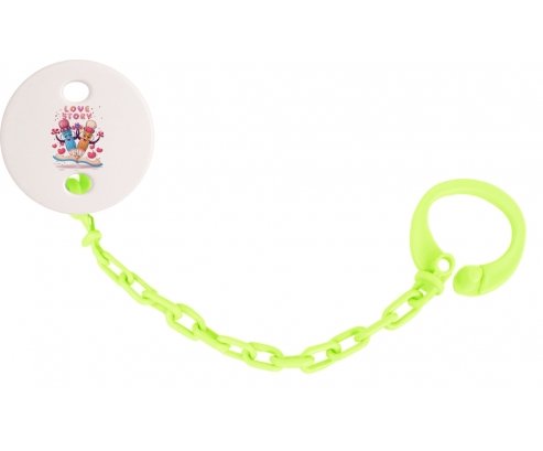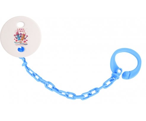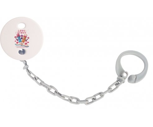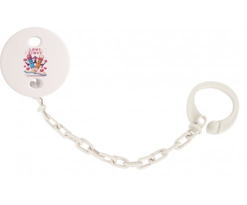 Attache tétine personnalisé Animaux rigolos Love story avec personnalisation design en couleur. Disponible en plusieurs coloris et plastique facile à laver. Pratique : permet une fixation facile de la sucette de bébé à son doudou et à ses vêtements en un seul clip. Hygiénique : empêche la sucette de tomber par terre et permet ainsi à bébé d'avoir une sucette propre toute la journée Visible : facile à repérer grâce aux motifs colorés.