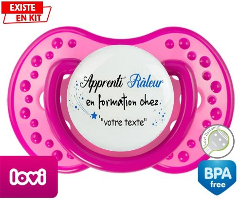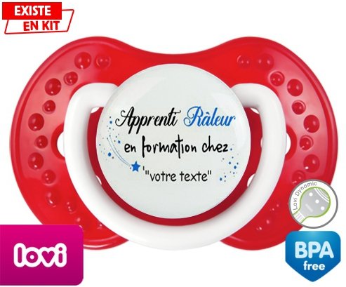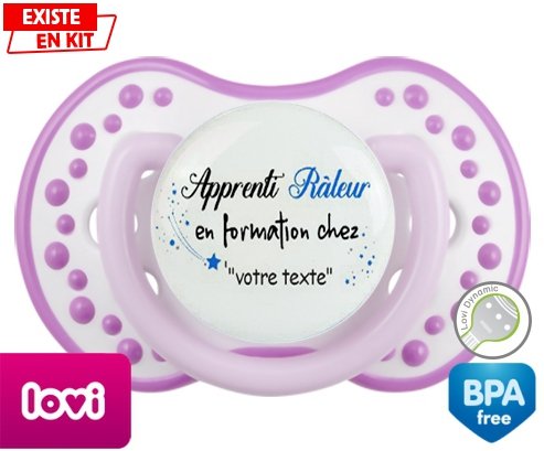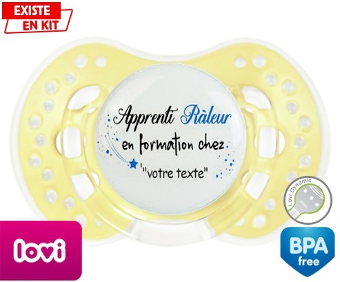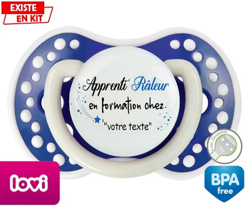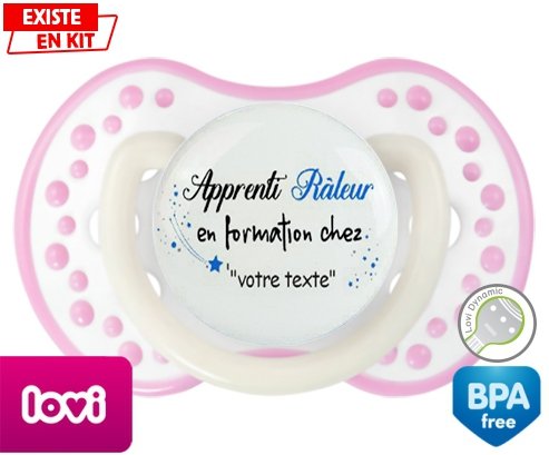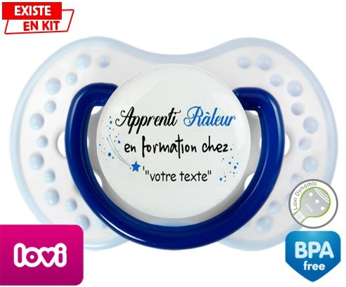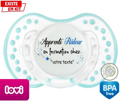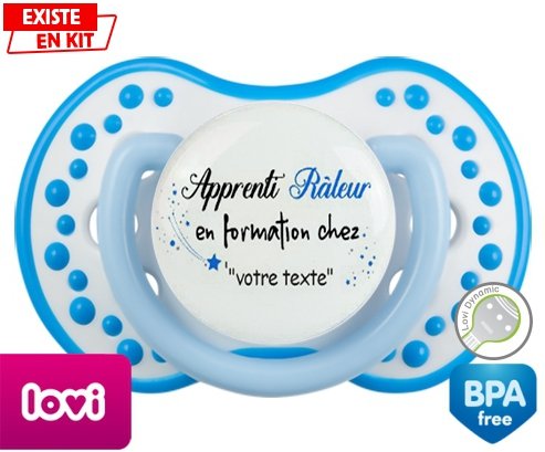 Sucette personnalisée pour bébé Apprenti râleur en formation chez... + prénom à embout LOVI Dynamic en silicone de la marque Lovi Dynamic avec impression en en Couleurs de la collection Prénom personnalisé.La silicone se reconnaît par sa couleur transparente. C'est une matière souple, douce, sans goût ni odeur et offre à bébé une succion plus facile grâce à sa souplesse.