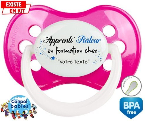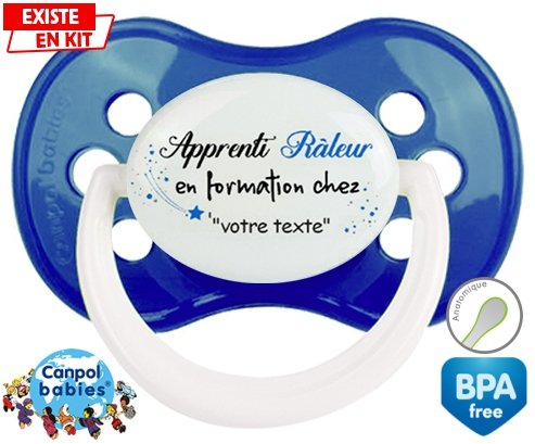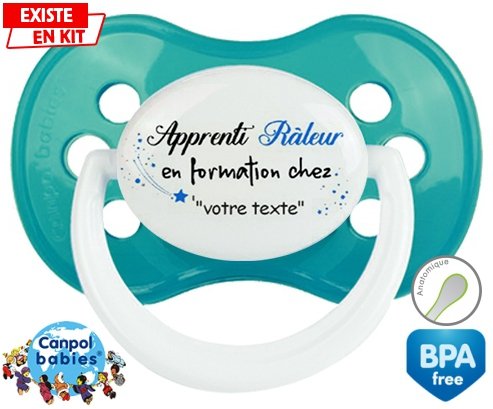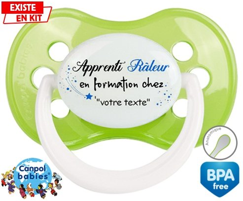 Tétine personnalisée pour bébé Apprenti râleur en formation chez... + prénom à embout Anatomique en silicone de la marque Canpol Babies avec impression en en Couleurs de la collection Prénom personnalisé.La silicone se reconnaît par sa couleur transparente. C'est une matière souple, douce, sans goût ni odeur et offre à bébé une succion plus facile grâce à sa souplesse.