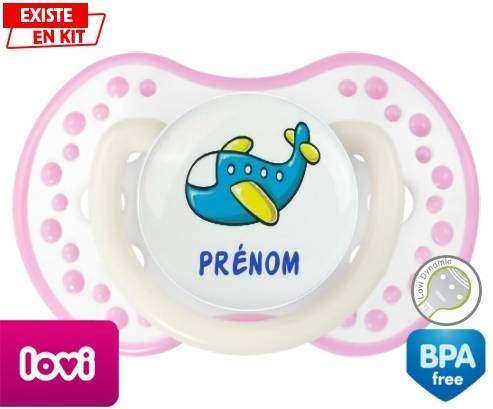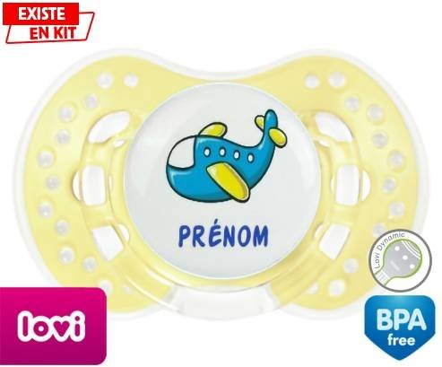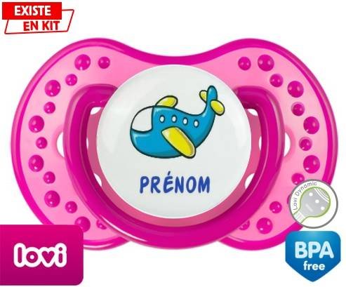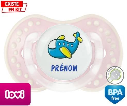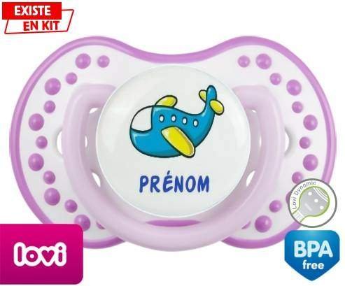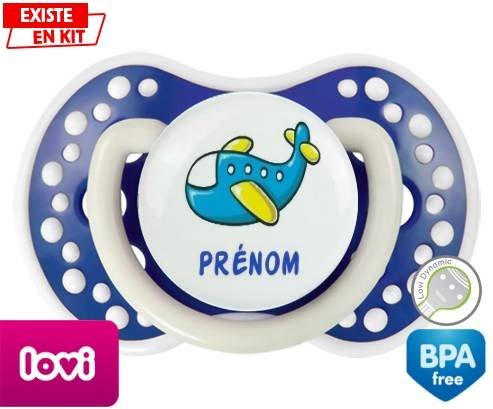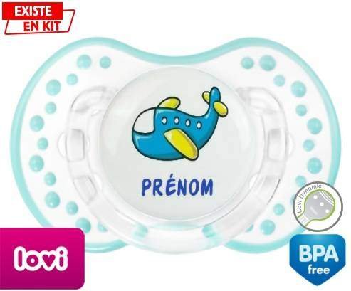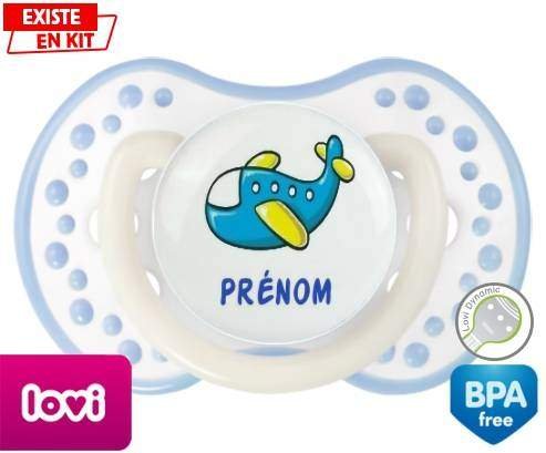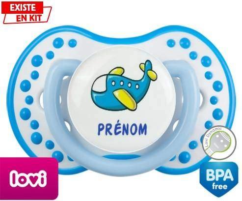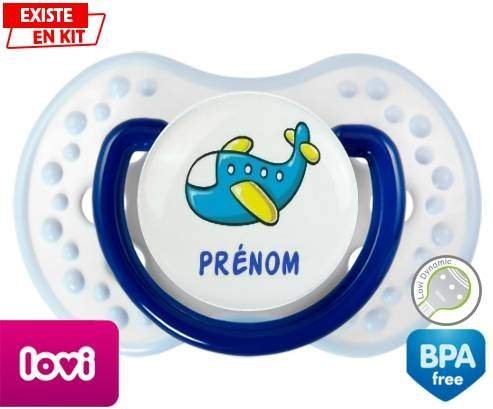 Tétine personnalisée pour bébé Avion bleu + prénom à embout LOVI Dynamic en silicone de la marque Lovi Dynamic avec impression en en Couleurs de la collection Prénom personnalisé.La silicone se reconnaît par sa couleur transparente. C'est une matière souple, douce, sans goût ni odeur et offre à bébé une succion plus facile grâce à sa souplesse.