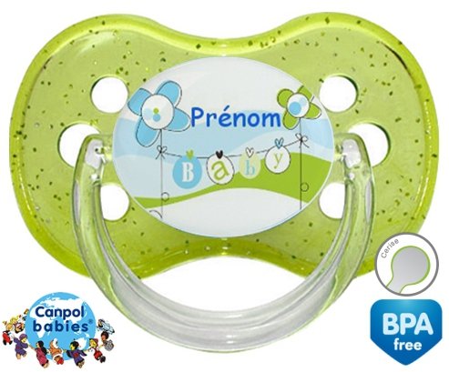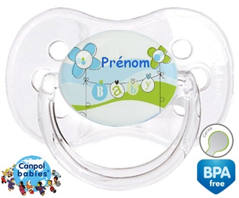 Tetine personnalisee pour bébé Baby bleu fleurs + prénom à embout Cerise en silicone de la marque Canpol Babies avec impression en en Couleurs de la collection Prénom personnalisé.La silicone se reconnaît par sa couleur transparente. C'est une matière souple, douce, sans goût ni odeur et offre à bébé une succion plus facile grâce à sa souplesse.