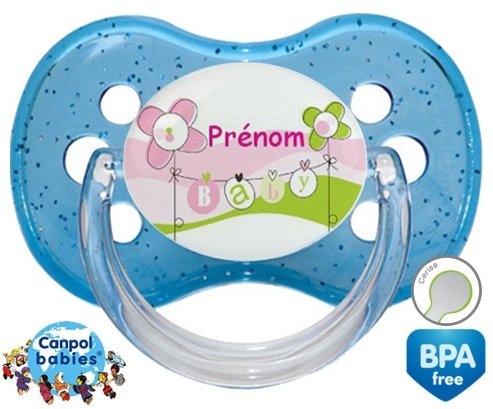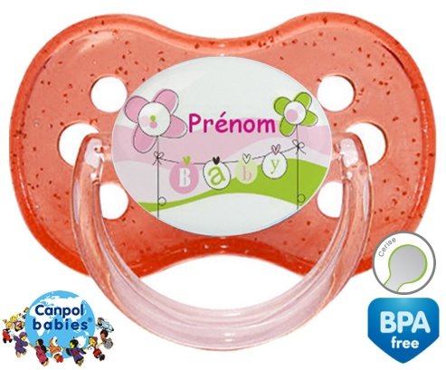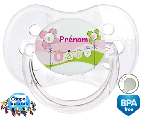 Sucette personnalisée pour bébé Baby rose fleurs + prénom à embout Cerise en silicone de la marque Canpol Babies avec impression en en Couleurs de la collection Prénom personnalisé.La silicone se reconnaît par sa couleur transparente. C'est une matière souple, douce, sans goût ni odeur et offre à bébé une succion plus facile grâce à sa souplesse.