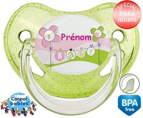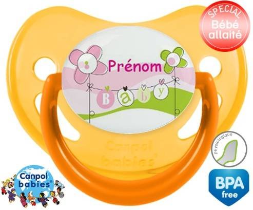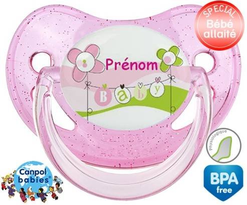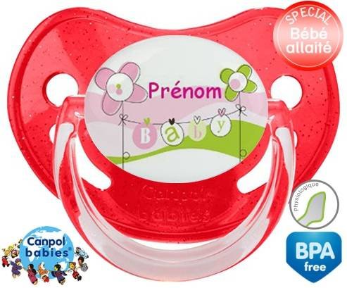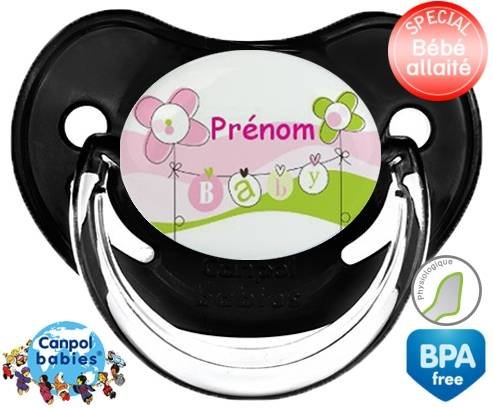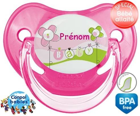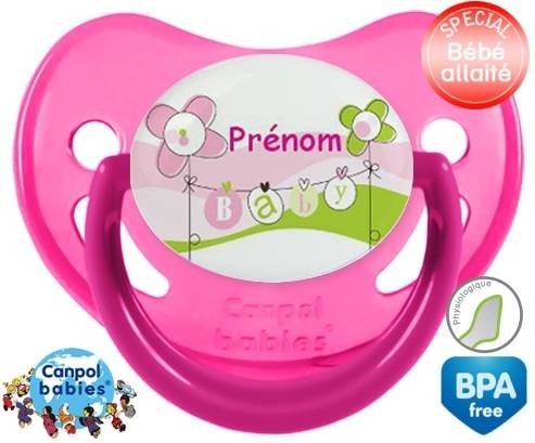 Tetine personnalisee avec le prénom pour bébé Baby rose fleurs + prénom : Embout Physiologique en silicone de la marque Canpol Babies avec impression en couleur.