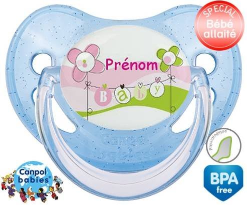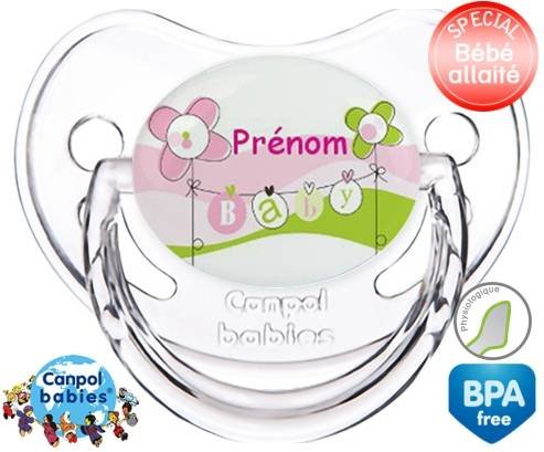 Tetine personnalisee pour bébé Baby rose fleurs + prénom à embout Physiologique en silicone de la marque Canpol Babies avec impression en en Couleurs de la collection Prénom personnalisé.La silicone se reconnaît par sa couleur transparente. C'est une matière souple, douce, sans goût ni odeur et offre à bébé une succion plus facile grâce à sa souplesse.
