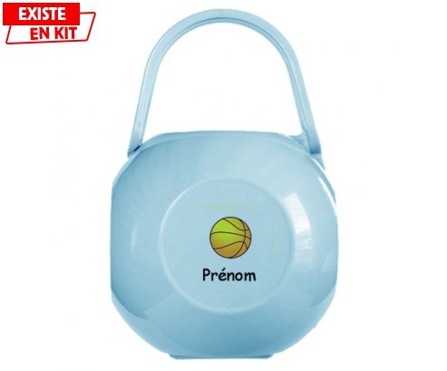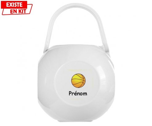 Boîte à sucette personnalisée : Ballon basket + prénom , avec une impression en couleur et qui compléte toute la gamme ( sucette, attache-sucette, bavoir, chausson, body et bonnet).