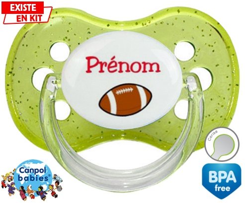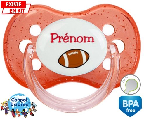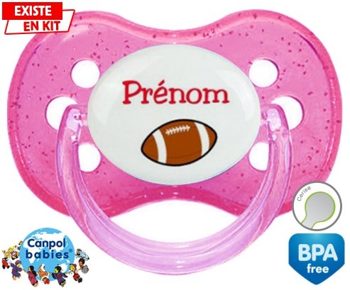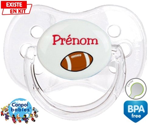 Tétine personnalisée pour bébé Ballon rugby style1 + prénom à embout Cerise en silicone de la marque Canpol Babies avec impression en en Couleurs de la collection Prénom personnalisé.La silicone se reconnaît par sa couleur transparente. C'est une matière souple, douce, sans goût ni odeur et offre à bébé une succion plus facile grâce à sa souplesse.