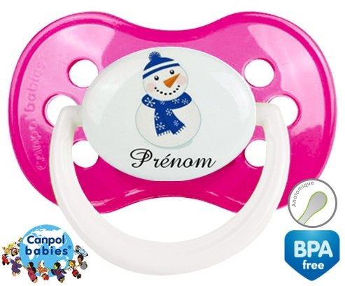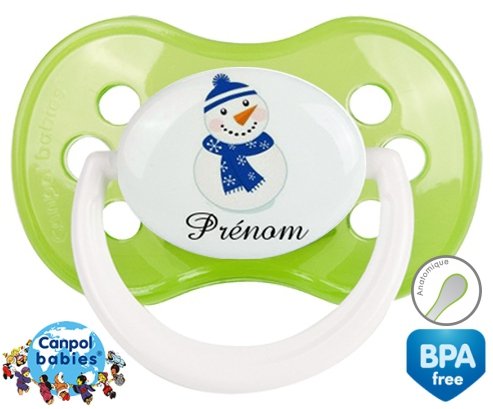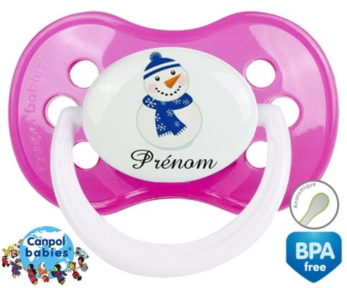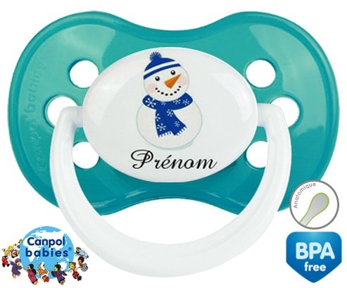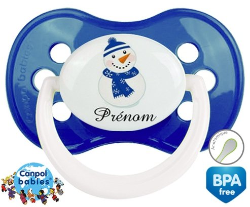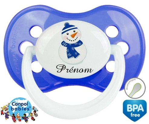 Sucette personnalisée avec le prénom pour bébé Bonhomme de neige bleu + prénom : Sucette Anatomique en silicone de la marque Canpol Babies avec impression en couleur.