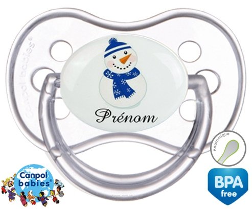 Sucette personnalisée pour bébé Bonhomme de neige bleu + prénom à embout Anatomique en silicone de la marque Canpol Babies avec impression en en Couleurs de la collection Prénom personnalisé.La silicone se reconnaît par sa couleur transparente. C'est une matière souple, douce, sans goût ni odeur et offre à bébé une succion plus facile grâce à sa souplesse.