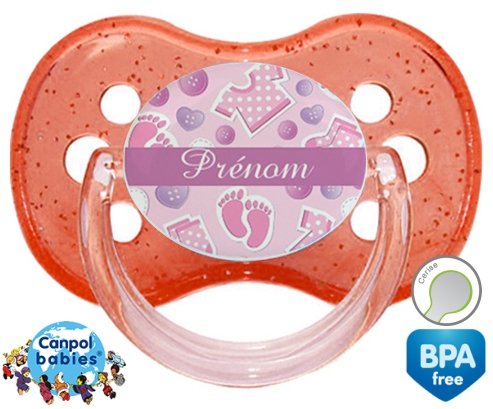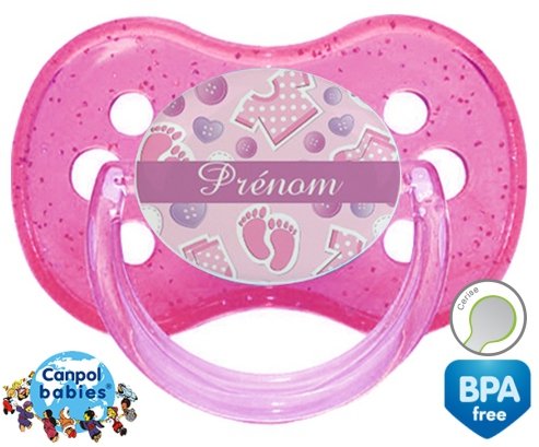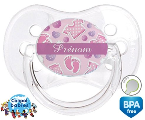 Tetine personnalisee pour bébé Bouton rose + prénom à embout Cerise en silicone de la marque Canpol Babies avec impression en en Couleurs de la collection Prénom personnalisé.La silicone se reconnaît par sa couleur transparente. C'est une matière souple, douce, sans goût ni odeur et offre à bébé une succion plus facile grâce à sa souplesse.