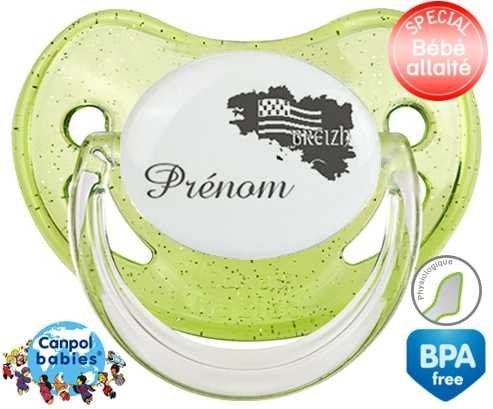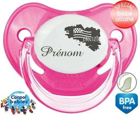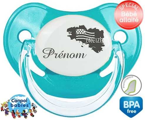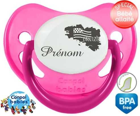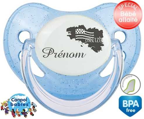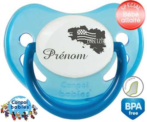 Sucette personnalisée pour bébé Bretagne + prénom à embout Physiologique en silicone de la marque Canpol Babies avec impression en en Gris de la collection Prénom personnalisé.La silicone se reconnaît par sa couleur transparente. C'est une matière souple, douce, sans goût ni odeur et offre à bébé une succion plus facile grâce à sa souplesse.
