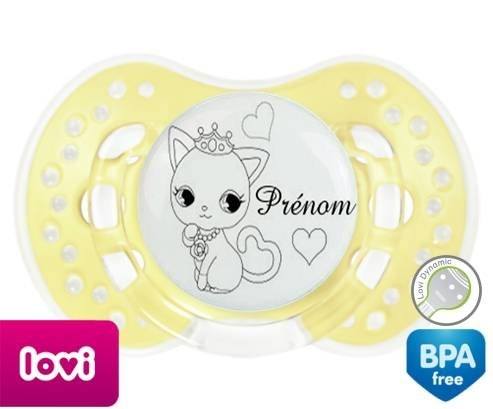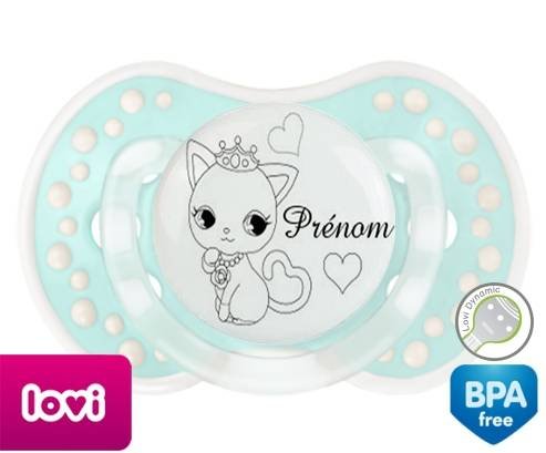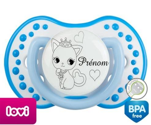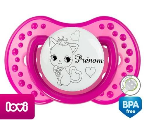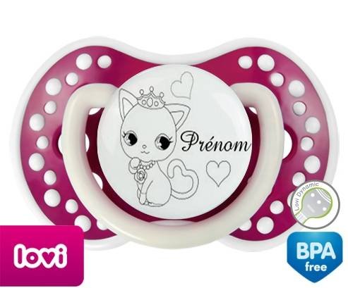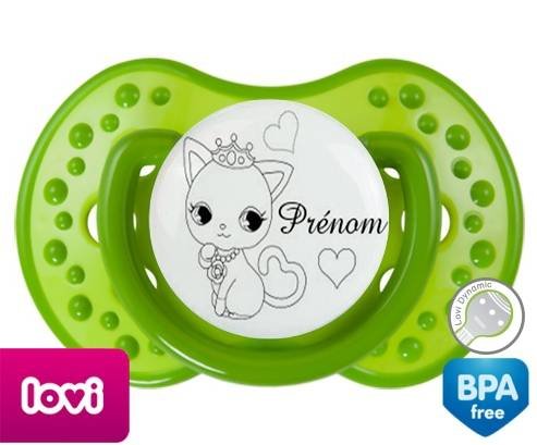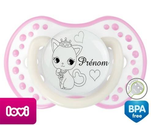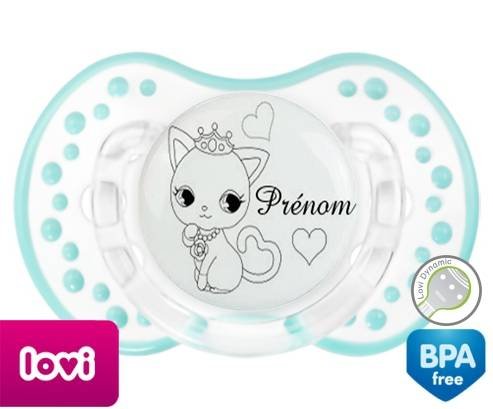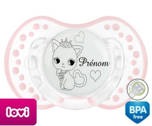 Tétine personnalisée pour bébé Chat princesse + prénom à embout LOVI Dynamic en silicone de la marque Lovi Dynamic avec impression en en Gris de la collection Prénom personnalisé.La silicone se reconnaît par sa couleur transparente. C'est une matière souple, douce, sans goût ni odeur et offre à bébé une succion plus facile grâce à sa souplesse.