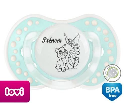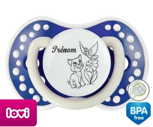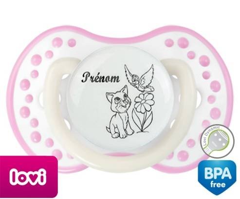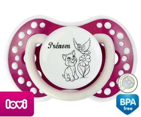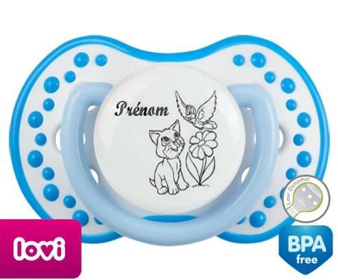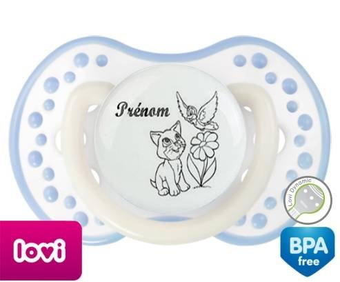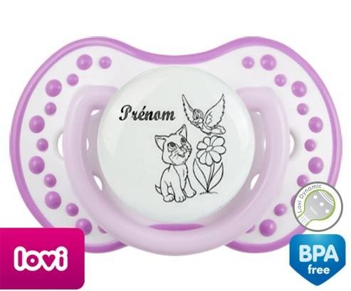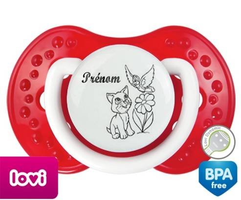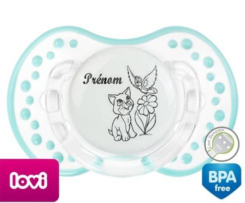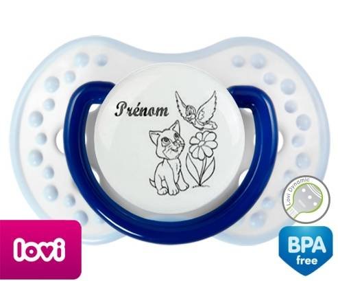 Tétine personnalisée pour bébé Chaton oiseau + prénom à embout LOVI Dynamic en silicone de la marque Lovi Dynamic avec impression en en Gris de la collection Prénom personnalisé.La silicone se reconnaît par sa couleur transparente. C'est une matière souple, douce, sans goût ni odeur et offre à bébé une succion plus facile grâce à sa souplesse.