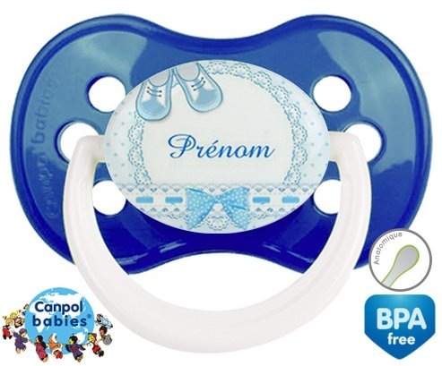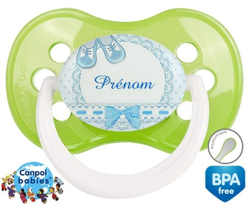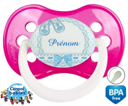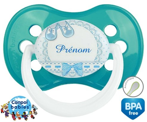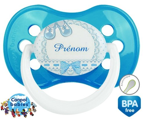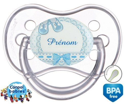 Sucette personnalisée pour bébé Chausson + prénom à embout Anatomique en silicone de la marque Canpol Babies avec impression en en Couleurs de la collection Prénom personnalisé.La silicone se reconnaît par sa couleur transparente. C'est une matière souple, douce, sans goût ni odeur et offre à bébé une succion plus facile grâce à sa souplesse.