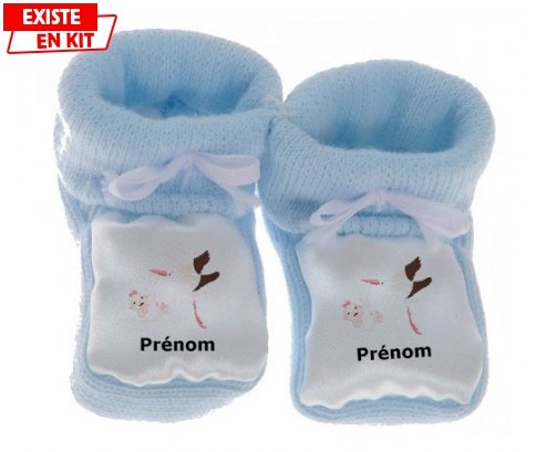 Su7.fr vous propose le chausson bébé personnalisé pour nouveau né avec le design : Cigogne (fille) + prénom . Ce chausson avec une impression en couleur compléte toute la gamme ( sucette, attache-sucette, bavoir, chausson, body , Boîte à sucette, et bonnet).
