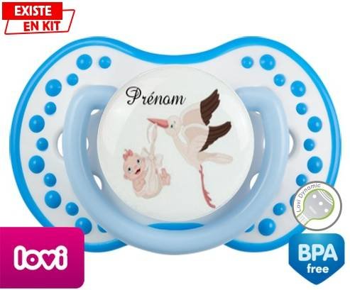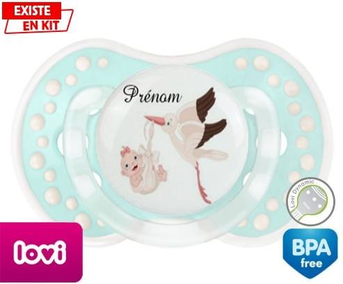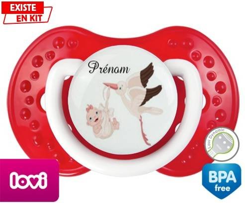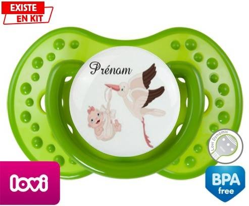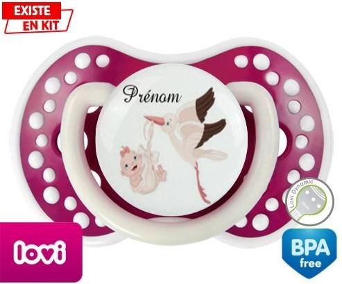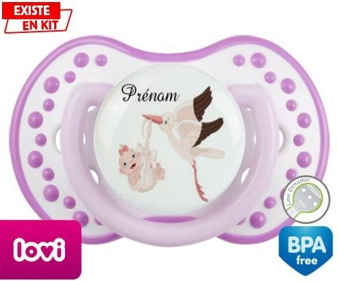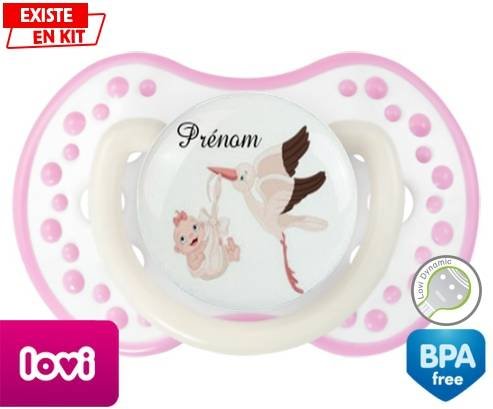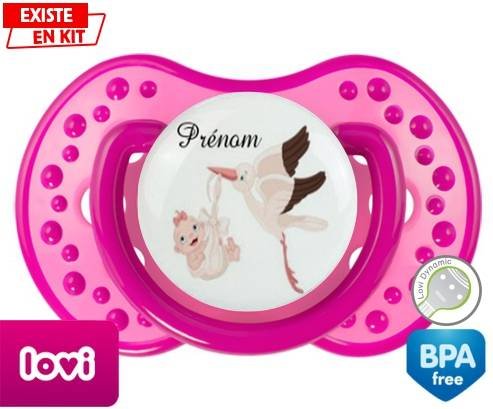 Tetine personnalisee avec le prénom pour bébé Cigogne (fille) + prénom : Embout LOVI Dynamic en silicone de la marque Lovi Dynamic avec impression en couleur.