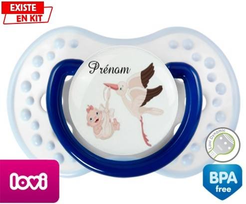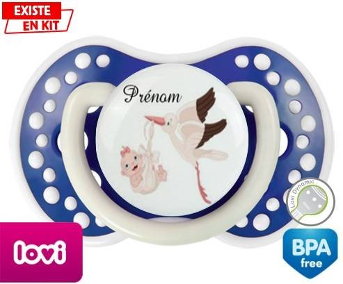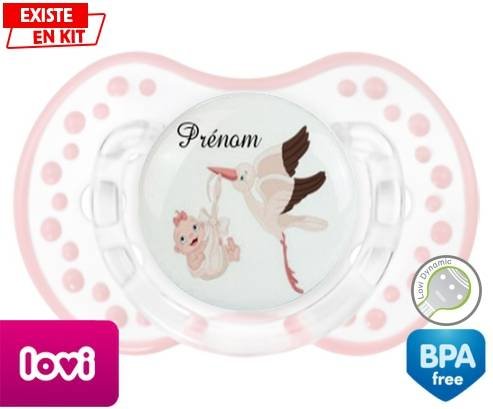 Tetine personnalisee pour bébé Cigogne (fille) + prénom à embout LOVI Dynamic en silicone de la marque Lovi Dynamic avec impression en en Couleurs de la collection Prénom personnalisé.La silicone se reconnaît par sa couleur transparente. C'est une matière souple, douce, sans goût ni odeur et offre à bébé une succion plus facile grâce à sa souplesse.