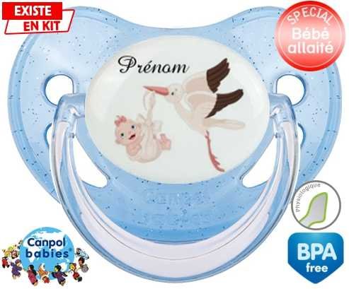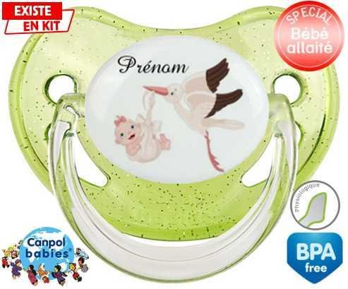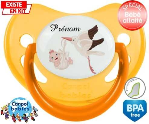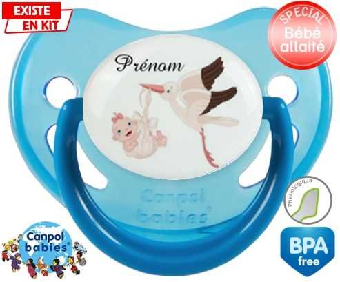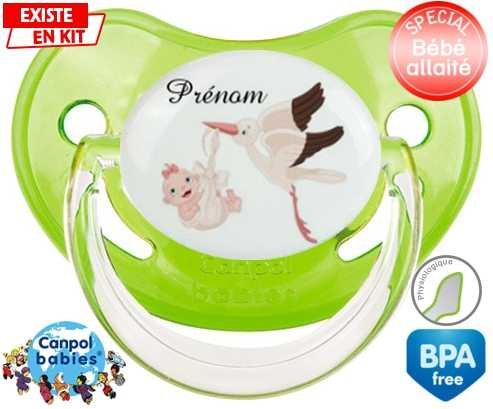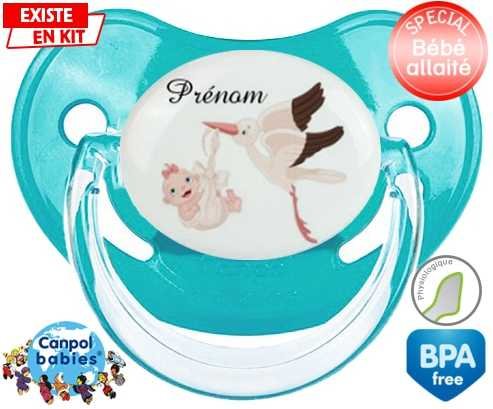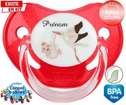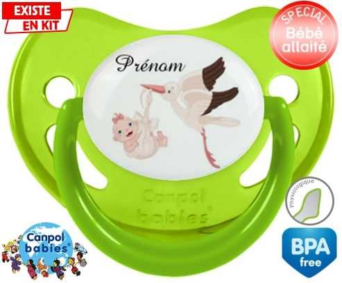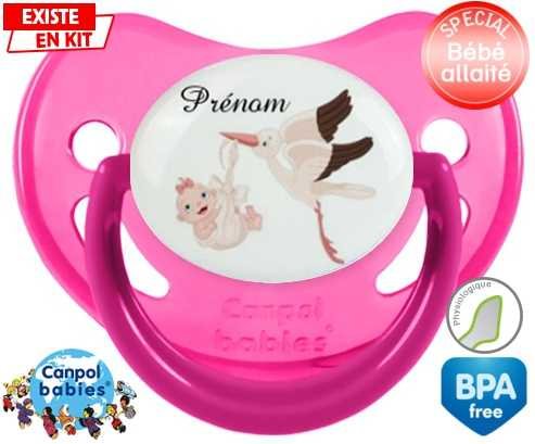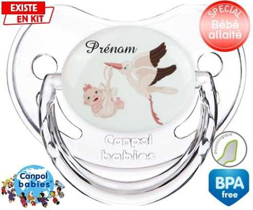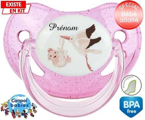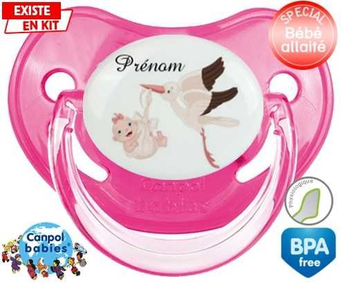 Sucette personnalisée pour bébé Cigogne (fille) + prénom à embout Physiologique en silicone de la marque Canpol Babies avec impression en en Couleurs de la collection Prénom personnalisé.La silicone se reconnaît par sa couleur transparente. C'est une matière souple, douce, sans goût ni odeur et offre à bébé une succion plus facile grâce à sa souplesse.