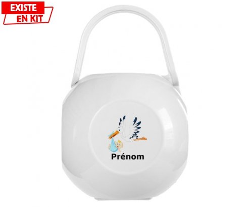 Boîte à sucette personnalisée : Cigogne (garçon) + prénom , avec une impression en couleur et qui compléte toute la gamme ( sucette, attache-sucette, bavoir, chausson, body et bonnet).