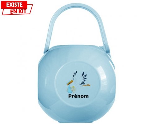 Boîte à sucette avec design : Cigogne (garçon) + prénom , impression de qualité et en couleur. Pratique : elle transporte la sucette en tout lieu. Grâce à sa poignée souple, elle est facile à accrocher à la poussette, sac à langer ... Cette boîte de rangement flexible, est la solution hygiénique pour protéger les sucettes de son enfant quand il ne les utilise pas. Peut contenir jusqu'à deux sucettes.