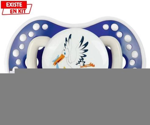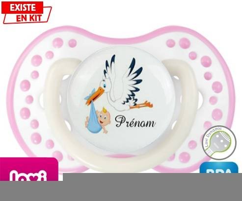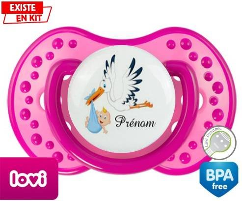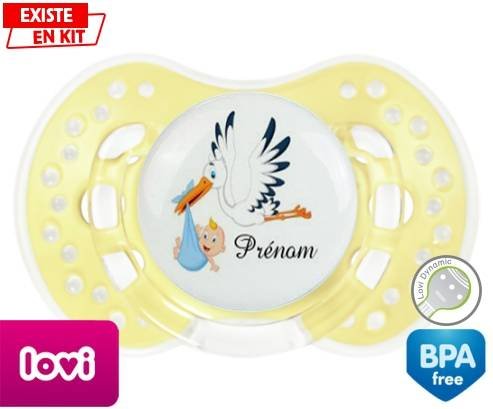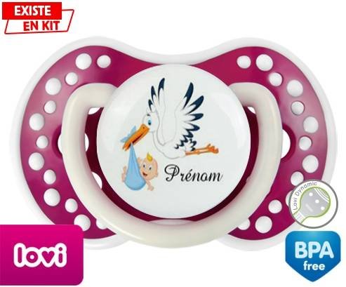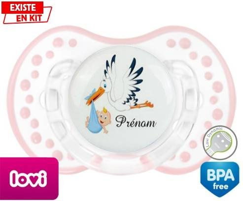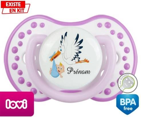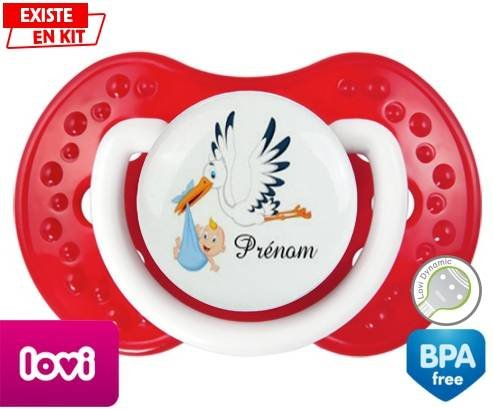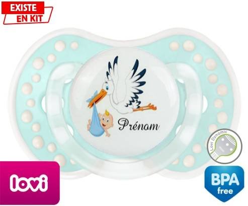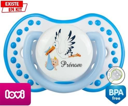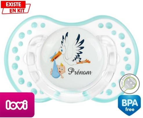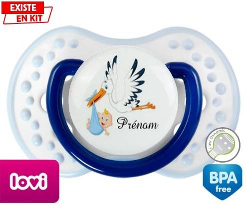 Tetine personnalisee pour bébé Cigogne (garçon) + prénom à embout LOVI Dynamic en silicone de la marque Lovi Dynamic avec impression en en Couleurs de la collection Prénom personnalisé.La silicone se reconnaît par sa couleur transparente. C'est une matière souple, douce, sans goût ni odeur et offre à bébé une succion plus facile grâce à sa souplesse.