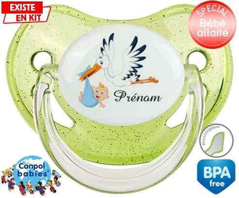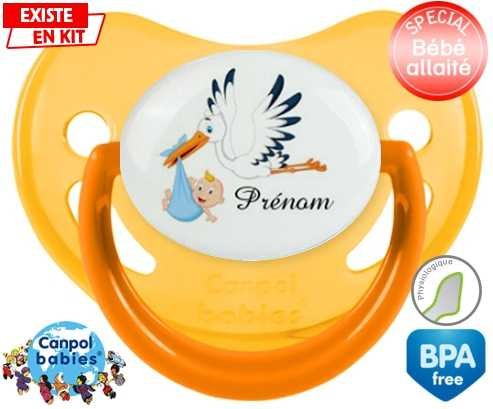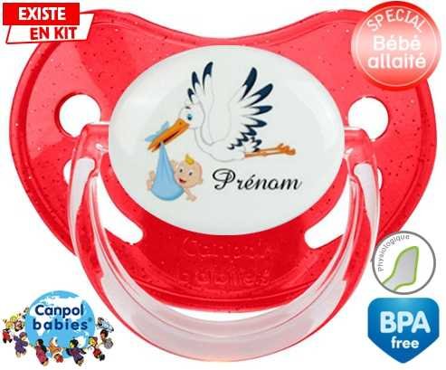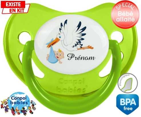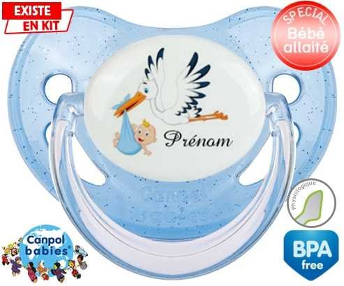 Tétine personnalisée pour bébé Cigogne (garçon) + prénom à embout Physiologique en silicone de la marque Canpol Babies avec impression en en Couleurs de la collection Prénom personnalisé.La silicone se reconnaît par sa couleur transparente. C'est une matière souple, douce, sans goût ni odeur et offre à bébé une succion plus facile grâce à sa souplesse.