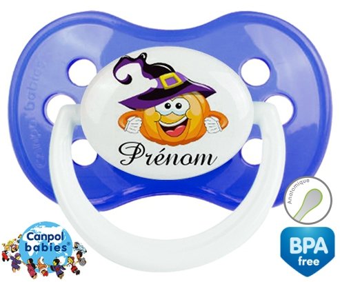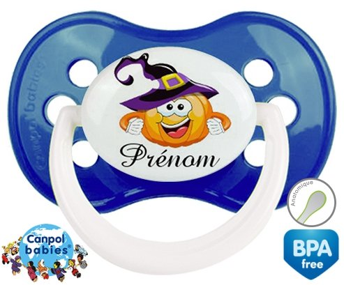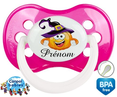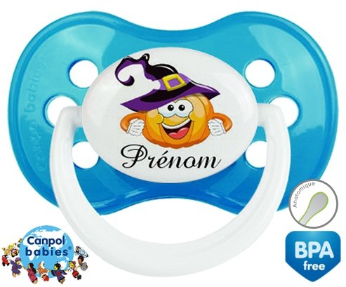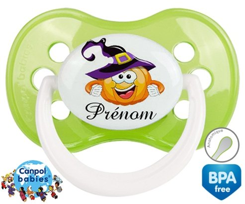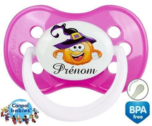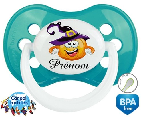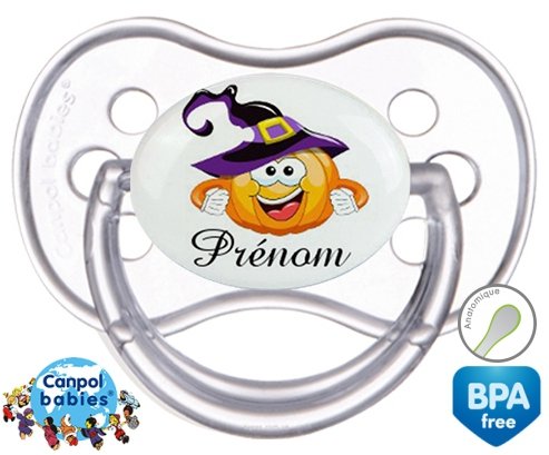 Sucette personnalisée pour bébé Citrouille chapeau + prénom à embout Anatomique en silicone de la marque Canpol Babies avec impression en en Couleurs de la collection Prénom personnalisé.La silicone se reconnaît par sa couleur transparente. C'est une matière souple, douce, sans goût ni odeur et offre à bébé une succion plus facile grâce à sa souplesse.