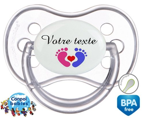 Tetine personnalisee pour bébé Coeur mixte + prénom à embout Anatomique en silicone de la marque Canpol Babies avec impression en en Couleurs de la collection Prénom personnalisé.La silicone se reconnaît par sa couleur transparente. C'est une matière souple, douce, sans goût ni odeur et offre à bébé une succion plus facile grâce à sa souplesse.