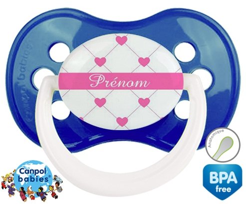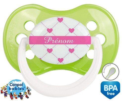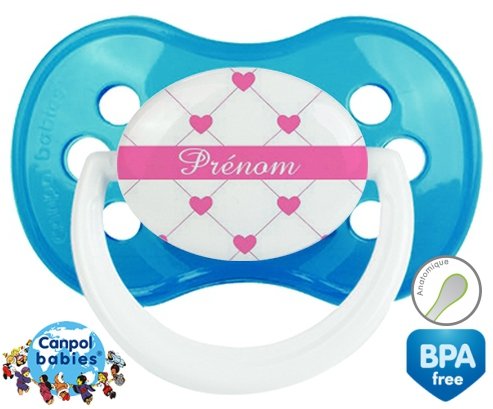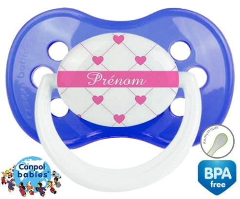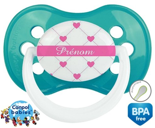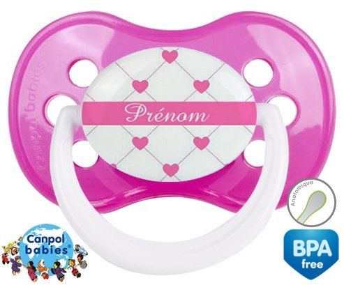 Sucette personnalisée avec le prénom pour bébé Coeur + prénom style1 : Sucette Anatomique en silicone de la marque Canpol Babies avec impression en couleur.