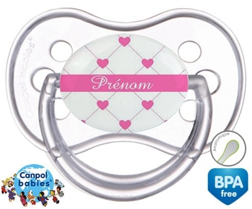 Sucette personnalisée pour bébé Coeur + prénom style1 à embout Anatomique en silicone de la marque Canpol Babies avec impression en en Couleurs de la collection Prénom personnalisé.La silicone se reconnaît par sa couleur transparente. C'est une matière souple, douce, sans goût ni odeur et offre à bébé une succion plus facile grâce à sa souplesse.