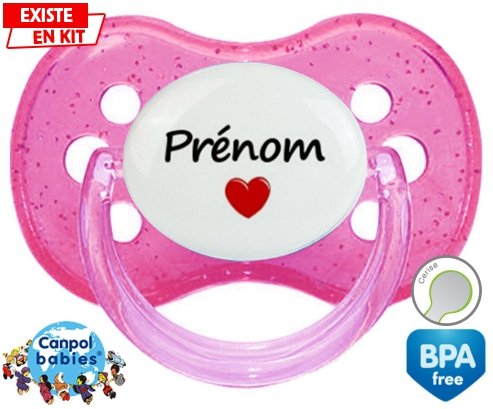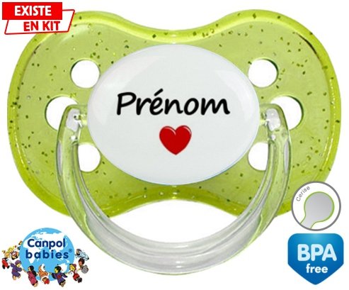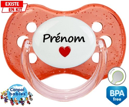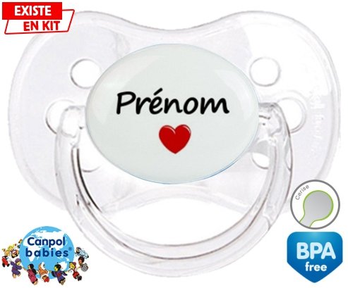 Tétine personnalisée pour bébé Coeur + prénom à embout Cerise en silicone de la marque Canpol Babies avec impression en en Couleurs de la collection Prénom personnalisé.La silicone se reconnaît par sa couleur transparente. C'est une matière souple, douce, sans goût ni odeur et offre à bébé une succion plus facile grâce à sa souplesse.