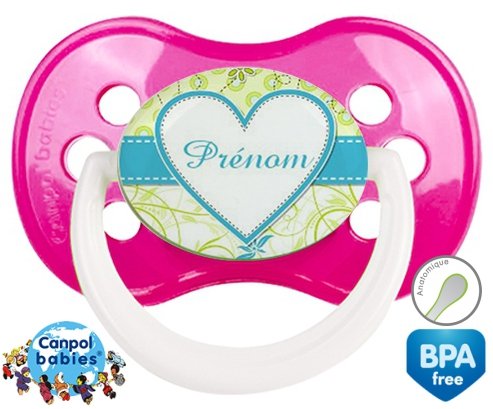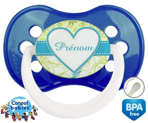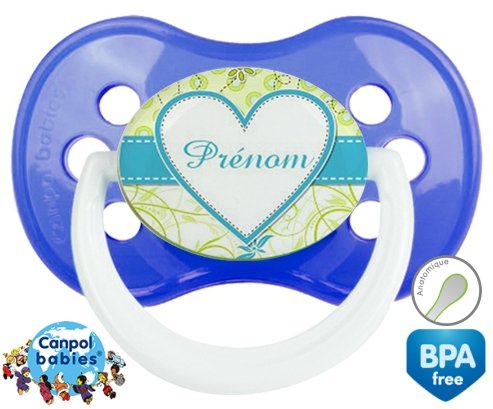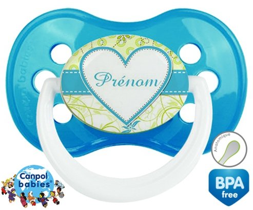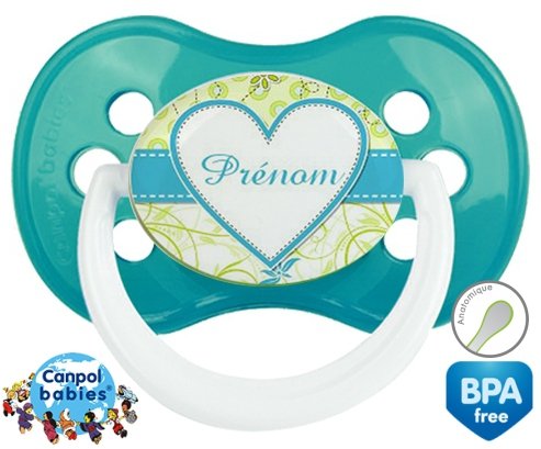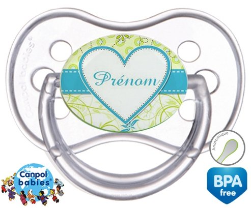 Sucette personnalisée pour bébé Coeur turquoise + prénom à embout Anatomique en silicone de la marque Canpol Babies avec impression en en Couleurs de la collection Prénom personnalisé.La silicone se reconnaît par sa couleur transparente. C'est une matière souple, douce, sans goût ni odeur et offre à bébé une succion plus facile grâce à sa souplesse.