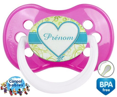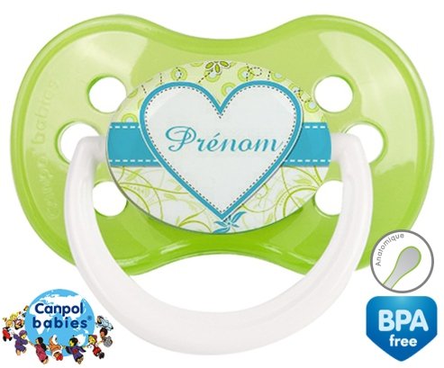 Sucette personnalisée avec le prénom pour bébé Coeur turquoise + prénom : Sucette Anatomique en silicone de la marque Canpol Babies avec impression en couleur.