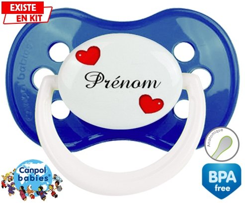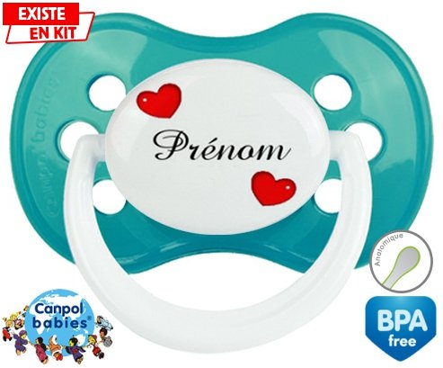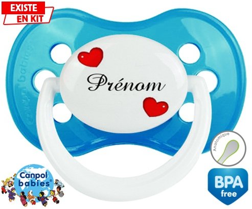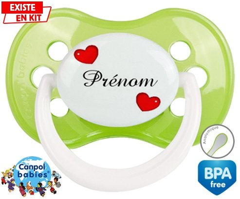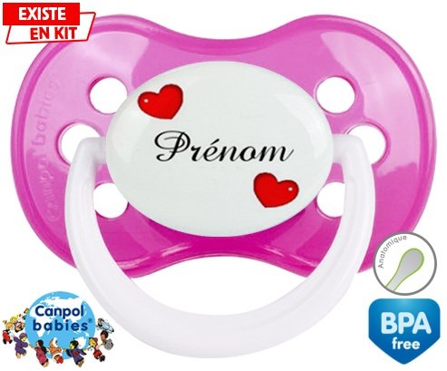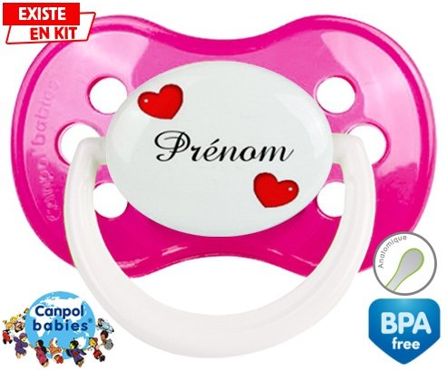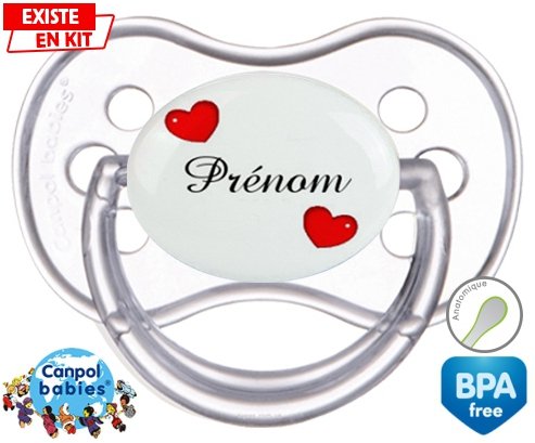 Sucette personnalisée pour bébé Cœurs Style2 + prénom à embout Anatomique en silicone de la marque Canpol Babies avec impression en en Couleurs de la collection Prénom personnalisé.La silicone se reconnaît par sa couleur transparente. C'est une matière souple, douce, sans goût ni odeur et offre à bébé une succion plus facile grâce à sa souplesse.