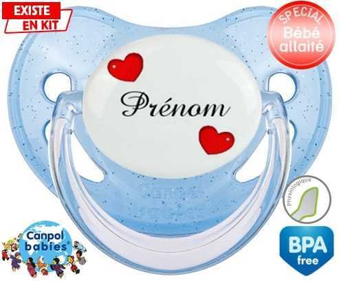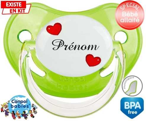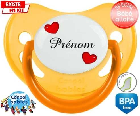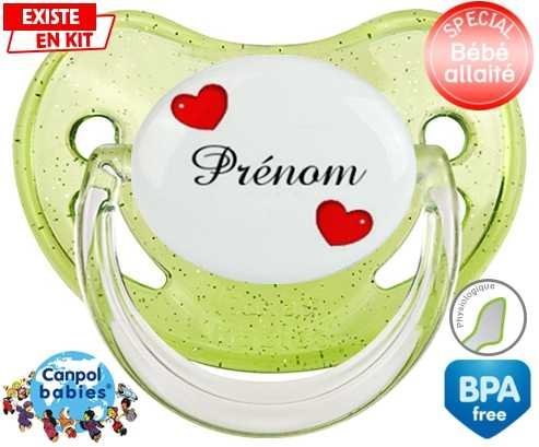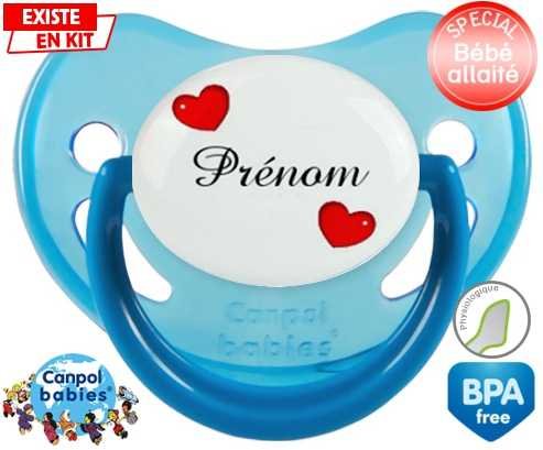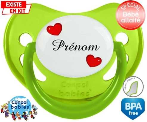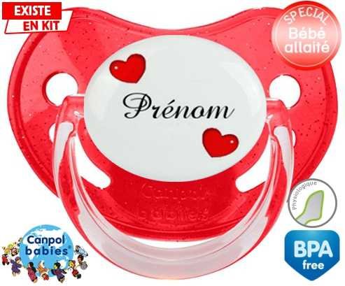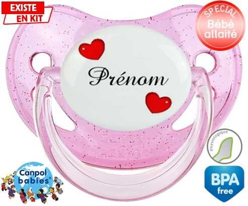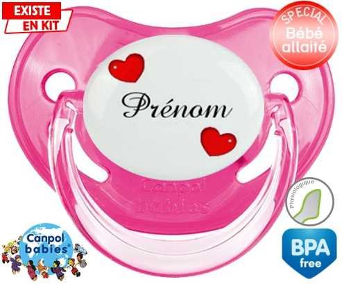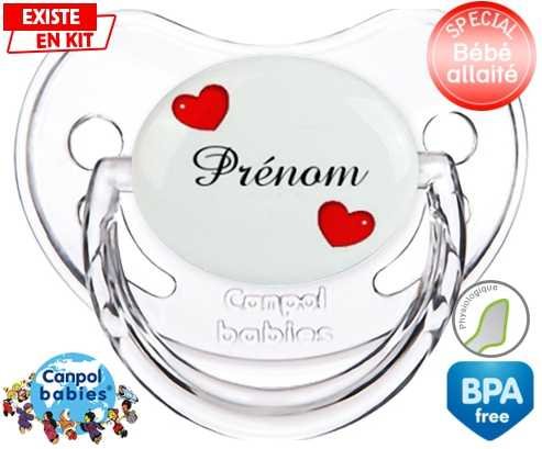 Tétine personnalisée pour bébé Cœurs Style2 + prénom à embout Physiologique en silicone de la marque Canpol Babies avec impression en en Couleurs de la collection Prénom personnalisé.La silicone se reconnaît par sa couleur transparente. C'est une matière souple, douce, sans goût ni odeur et offre à bébé une succion plus facile grâce à sa souplesse.