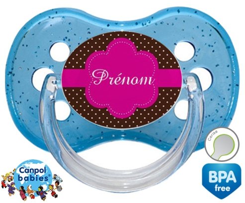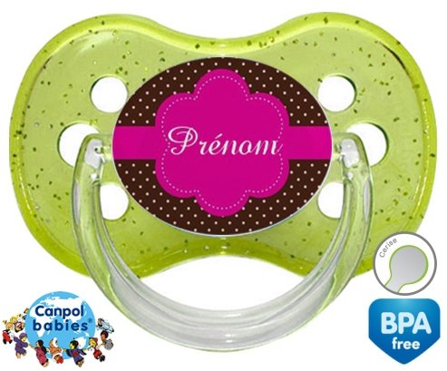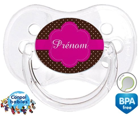 Sucette personnalisée pour bébé Design marron (fille) + prénom à embout Cerise en silicone de la marque Canpol Babies avec impression en en Couleurs de la collection Prénom personnalisé.La silicone se reconnaît par sa couleur transparente. C'est une matière souple, douce, sans goût ni odeur et offre à bébé une succion plus facile grâce à sa souplesse.