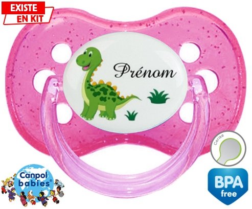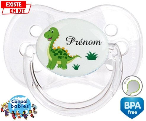 Sucette personnalisée pour bébé Dinosaure + prénom à embout Cerise en silicone de la marque Canpol Babies avec impression en en Couleurs de la collection Prénom personnalisé.La silicone se reconnaît par sa couleur transparente. C'est une matière souple, douce, sans goût ni odeur et offre à bébé une succion plus facile grâce à sa souplesse.