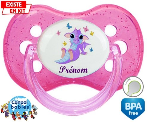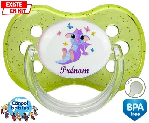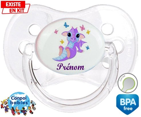 Sucette personnalisée pour bébé Dragon papillons + prénom à embout Cerise en silicone de la marque Canpol Babies avec impression en en Couleurs de la collection Prénom personnalisé.La silicone se reconnaît par sa couleur transparente. C'est une matière souple, douce, sans goût ni odeur et offre à bébé une succion plus facile grâce à sa souplesse.