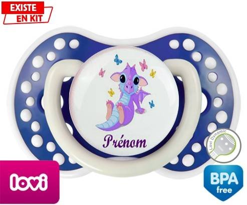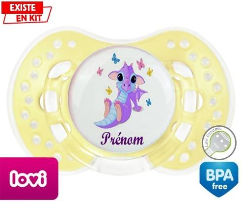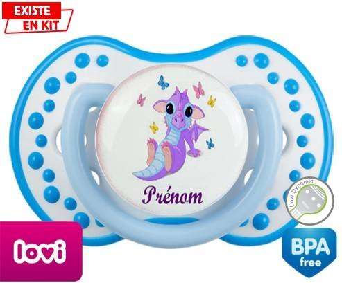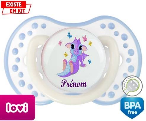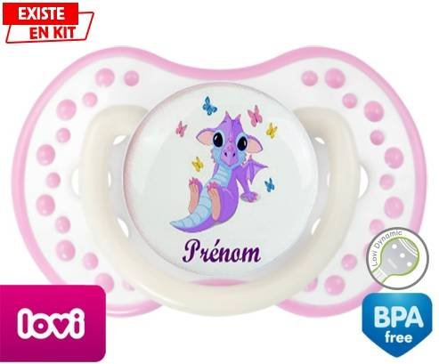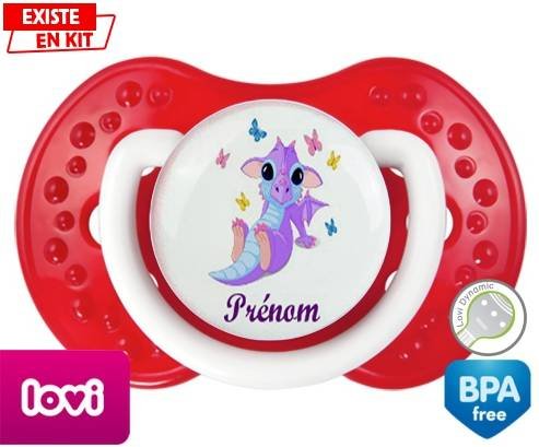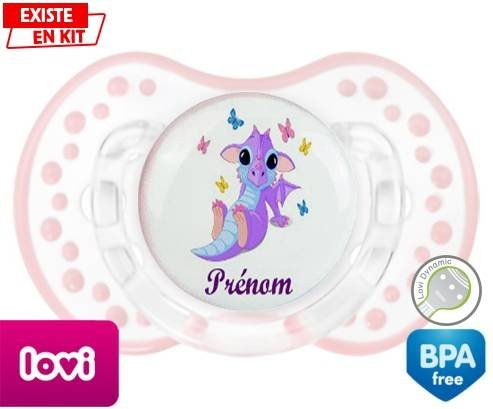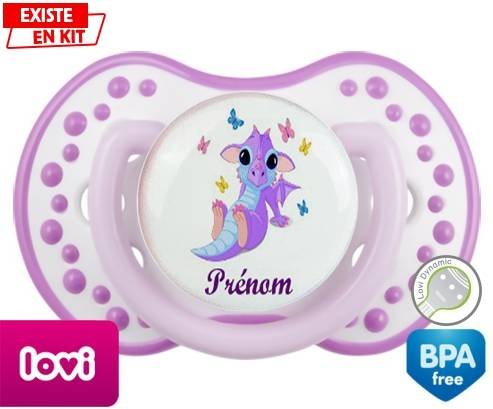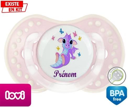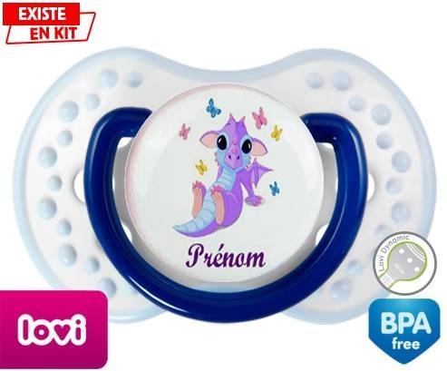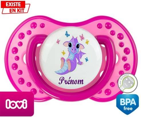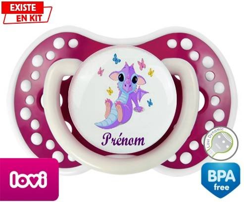Sucette personnalisée pour bébé Dragon papillons + prénom à embout LOVI Dynamic en silicone de la marque Lovi Dynamic avec impression en en Couleurs de la collection Prénom personnalisé.La silicone se reconnaît par sa couleur transparente. C'est une matière souple, douce, sans goût ni odeur et offre à bébé une succion plus facile grâce à sa souplesse.