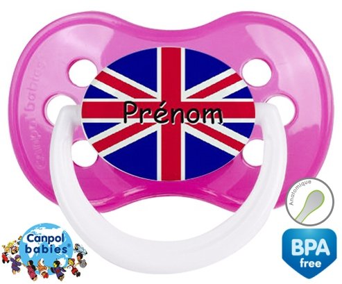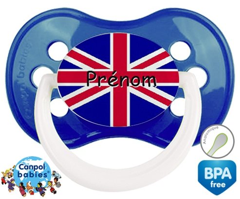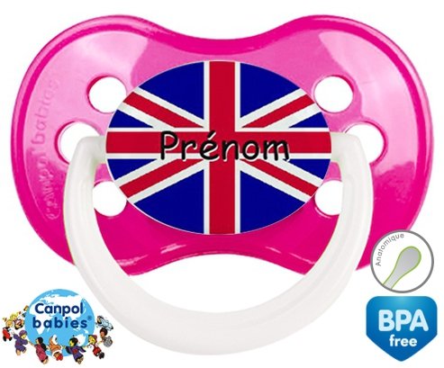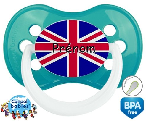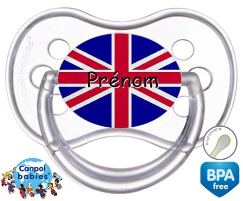 Sucette personnalisée pour bébé Drapeau angleterre + prénom à embout Anatomique en silicone de la marque Canpol Babies avec impression en en Couleurs de la collection Prénom personnalisé.La silicone se reconnaît par sa couleur transparente. C'est une matière souple, douce, sans goût ni odeur et offre à bébé une succion plus facile grâce à sa souplesse.