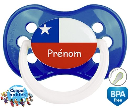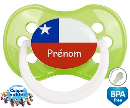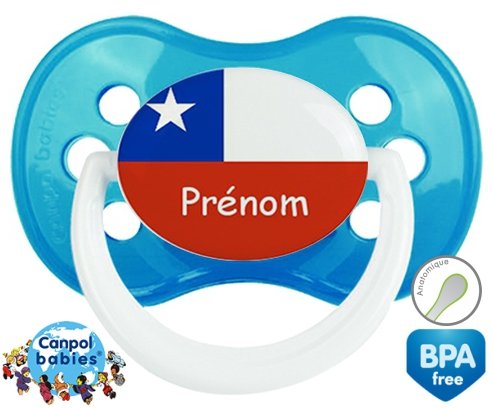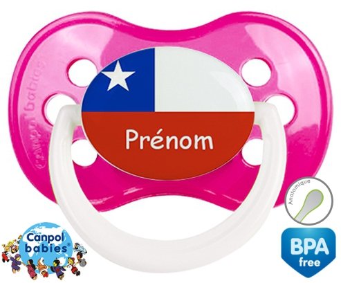 Sucette personnalisée pour bébé Drapeau chili + prénom à embout Anatomique en silicone de la marque Canpol Babies avec impression en en Couleurs de la collection Prénom personnalisé.La silicone se reconnaît par sa couleur transparente. C'est une matière souple, douce, sans goût ni odeur et offre à bébé une succion plus facile grâce à sa souplesse.