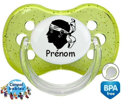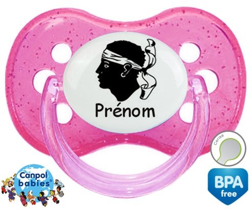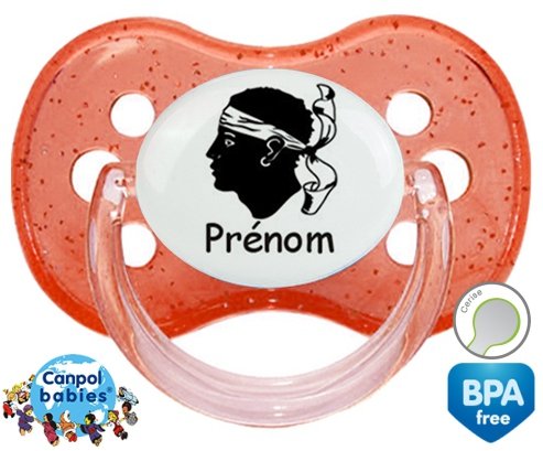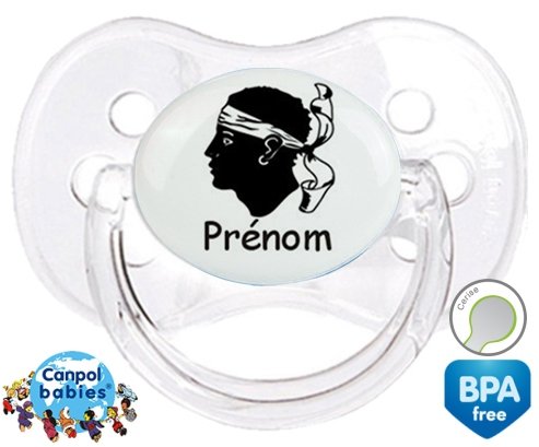 Sucette personnalisée pour bébé Drapeau corse + prénom à embout Cerise en silicone de la marque Canpol Babies avec impression en en Couleurs de la collection Prénom personnalisé.La silicone se reconnaît par sa couleur transparente. C'est une matière souple, douce, sans goût ni odeur et offre à bébé une succion plus facile grâce à sa souplesse.