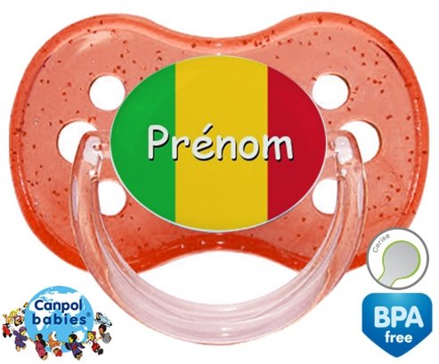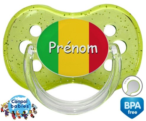 Sucette personnalisée pour bébé Drapeau du mali + prénom à embout Cerise en silicone de la marque Canpol Babies avec impression en en Couleurs de la collection Prénom personnalisé.La silicone se reconnaît par sa couleur transparente. C'est une matière souple, douce, sans goût ni odeur et offre à bébé une succion plus facile grâce à sa souplesse.