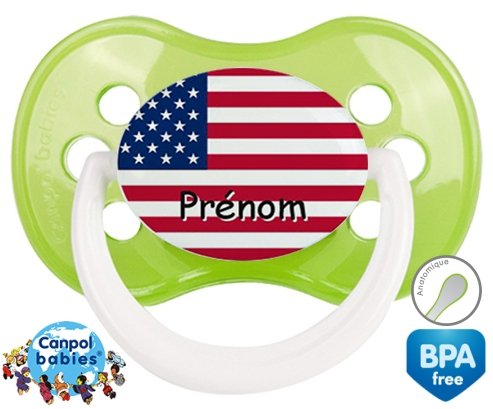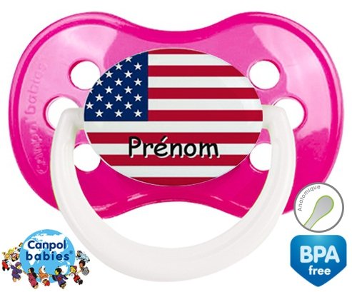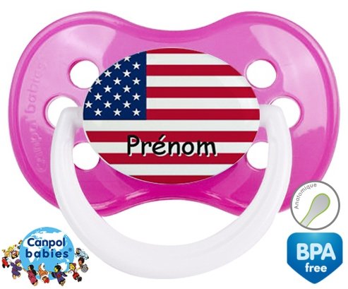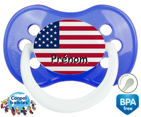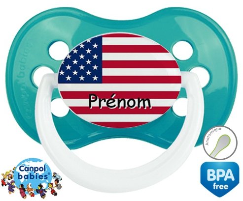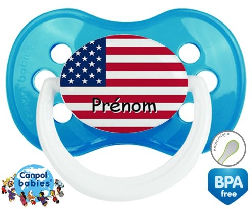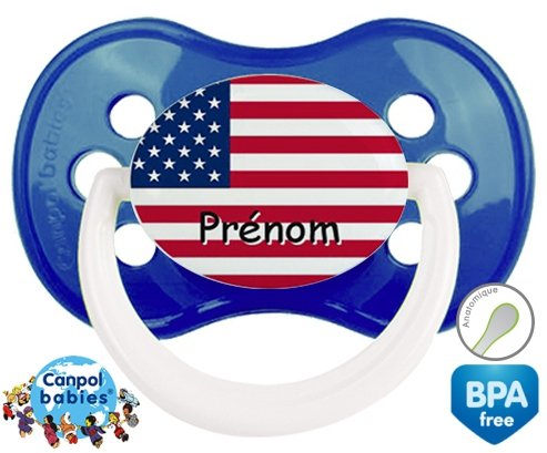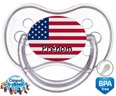 Tetine personnalisee pour bébé Drapeau etats unis + prénom à embout Anatomique en silicone de la marque Canpol Babies avec impression en en Couleurs de la collection Prénom personnalisé.La silicone se reconnaît par sa couleur transparente. C'est une matière souple, douce, sans goût ni odeur et offre à bébé une succion plus facile grâce à sa souplesse.