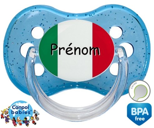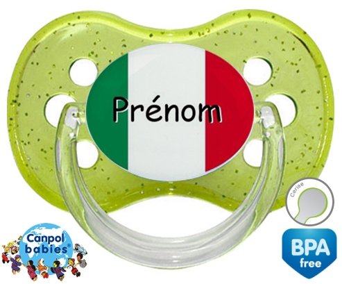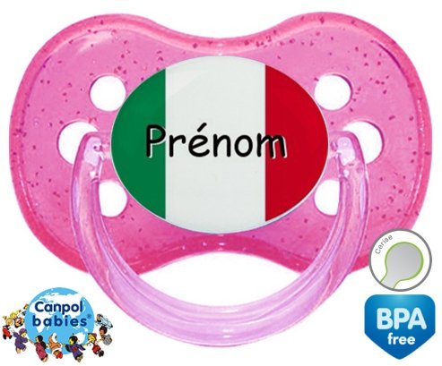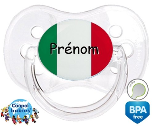 Tetine personnalisee pour bébé Drapeau italie + prénom à embout Cerise en silicone de la marque Canpol Babies avec impression en en Couleurs de la collection Prénom personnalisé.La silicone se reconnaît par sa couleur transparente. C'est une matière souple, douce, sans goût ni odeur et offre à bébé une succion plus facile grâce à sa souplesse.