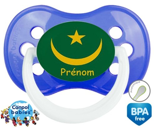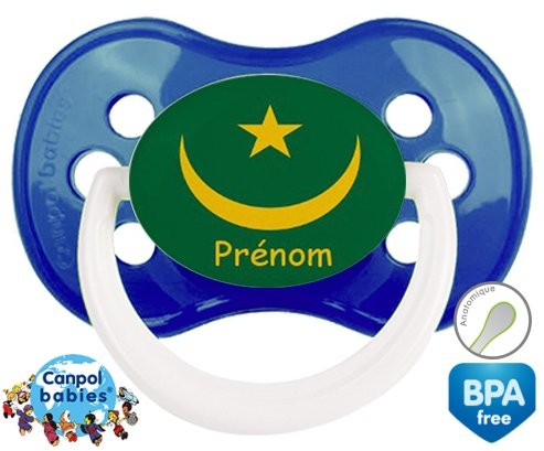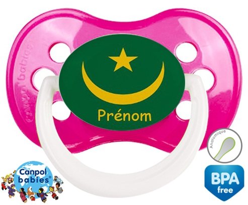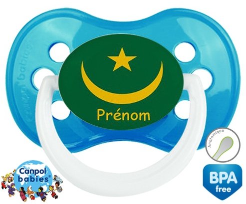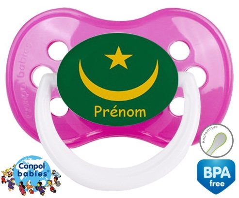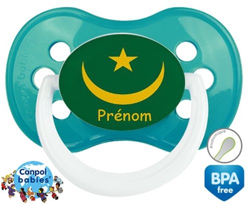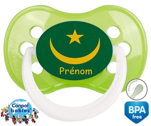 Sucette personnalisée pour bébé Drapeau mauritanie + prénom à embout Anatomique en silicone de la marque Canpol Babies avec impression en en Couleurs de la collection Prénom personnalisé.La silicone se reconnaît par sa couleur transparente. C'est une matière souple, douce, sans goût ni odeur et offre à bébé une succion plus facile grâce à sa souplesse.