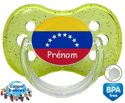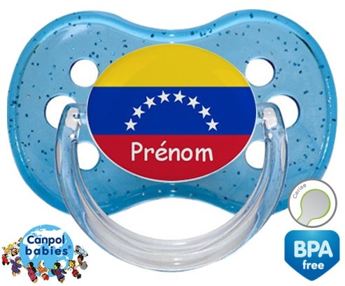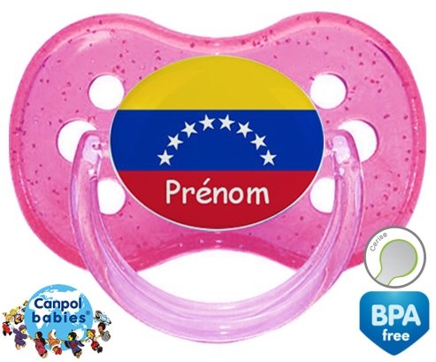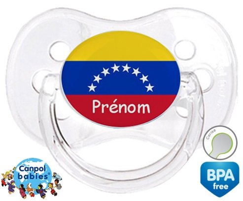 Tetine personnalisee pour bébé Drapeau vénézuéla + prénom à embout Cerise en silicone de la marque Canpol Babies avec impression en en Couleurs de la collection Prénom personnalisé.La silicone se reconnaît par sa couleur transparente. C'est une matière souple, douce, sans goût ni odeur et offre à bébé une succion plus facile grâce à sa souplesse.