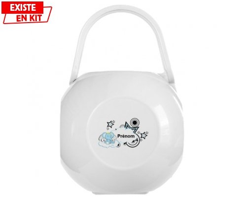 Boîte à sucette personnalisée : Eléphant style3 + prénom , avec une impression en couleur et qui compléte toute la gamme ( sucette, attache-sucette, bavoir, chausson, body et bonnet).