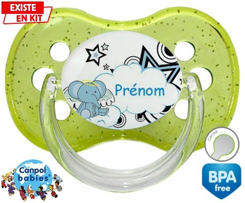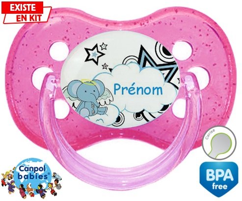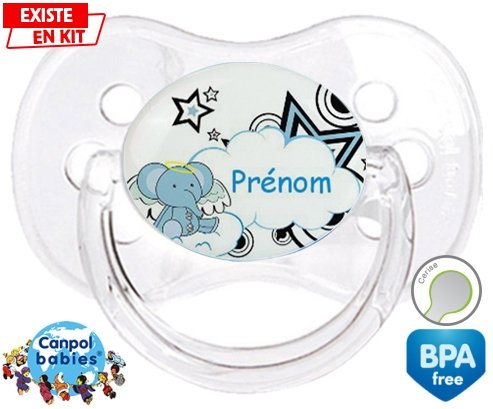 Tetine personnalisee pour bébé Eléphant style3 + prénom à embout Cerise en silicone de la marque Canpol Babies avec impression en en Couleurs de la collection Prénom personnalisé.La silicone se reconnaît par sa couleur transparente. C'est une matière souple, douce, sans goût ni odeur et offre à bébé une succion plus facile grâce à sa souplesse.