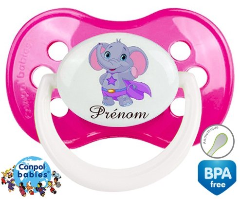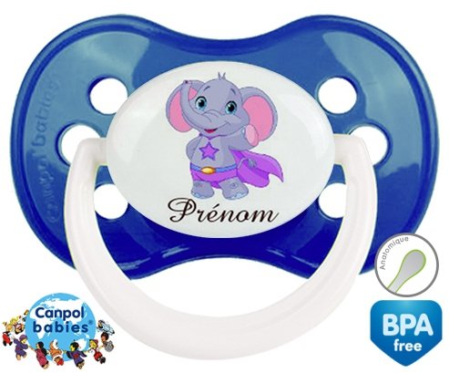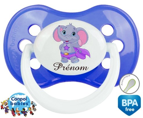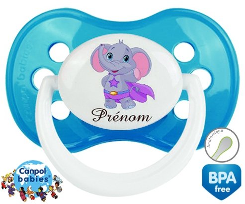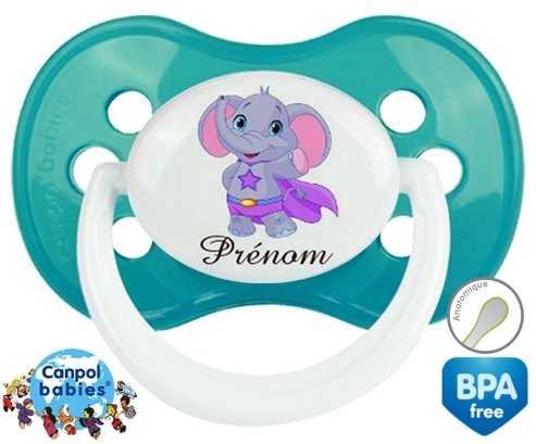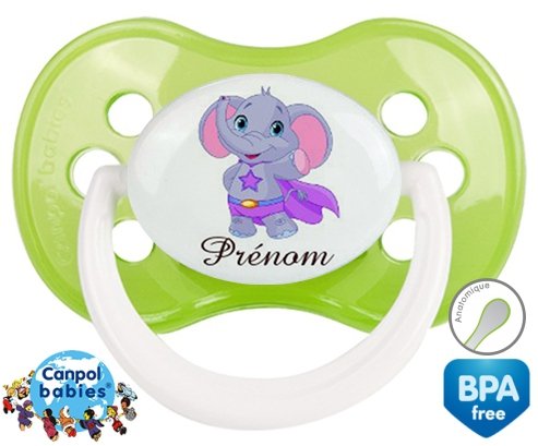 Tetine personnalisee pour bébé Elephant super héros + prénom à embout Anatomique en silicone de la marque Canpol Babies avec impression en en Couleurs de la collection Prénom personnalisé.La silicone se reconnaît par sa couleur transparente. C'est une matière souple, douce, sans goût ni odeur et offre à bébé une succion plus facile grâce à sa souplesse.